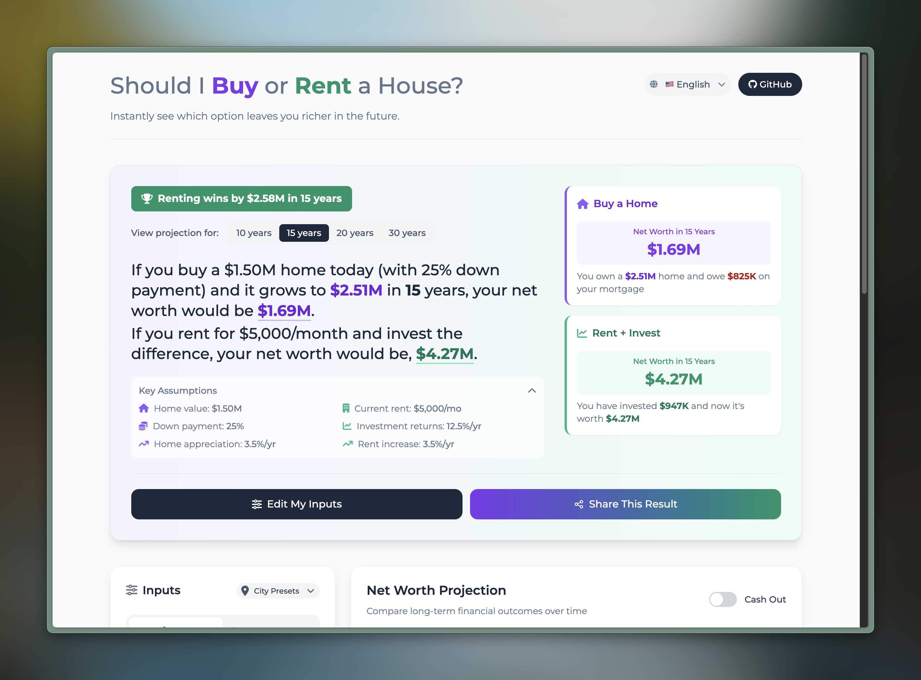 在计算的时候,比较重要的 input 都会考虑在内,包括对于买房来说初始的 Down Payment, Closing Cost, 后面 recurring 的每年的贷款利息、房产税、HOA、房屋维护费、房贷利息个税抵扣(Claim Mortgage Interest Deduction)等等。有兴趣可以自己到网站上用不同的 input 试算。